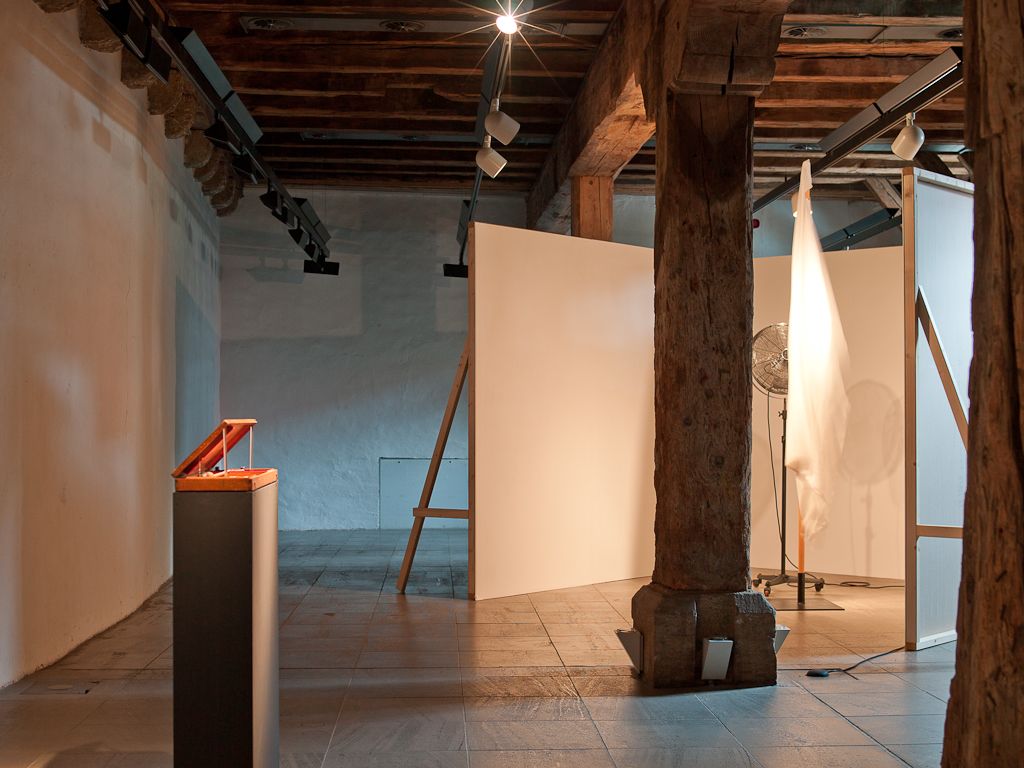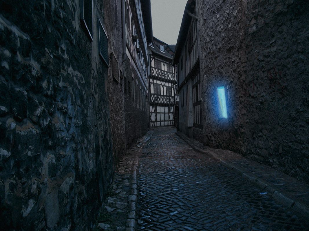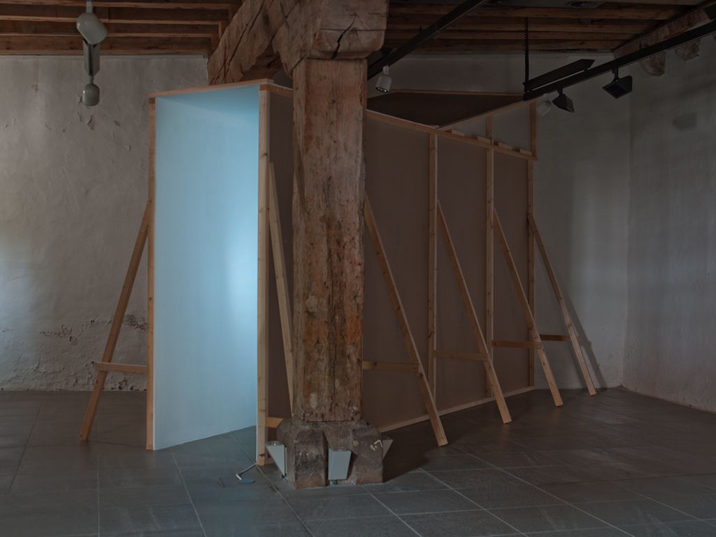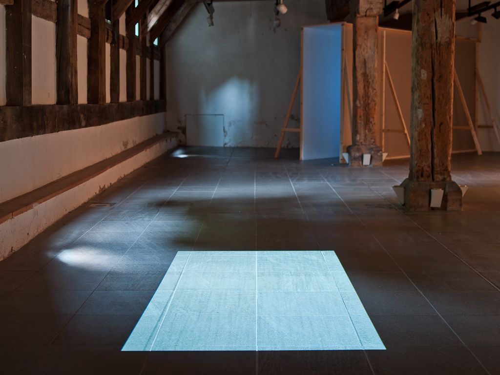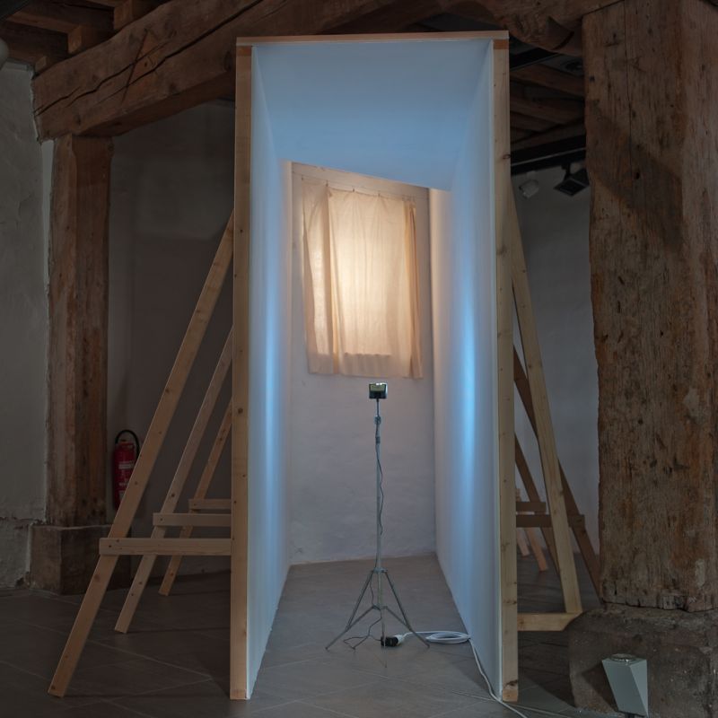 Zuhause, Installation Waidspeicher Erfurt, 2014. TV-Simulator, Stativ, Batterie.